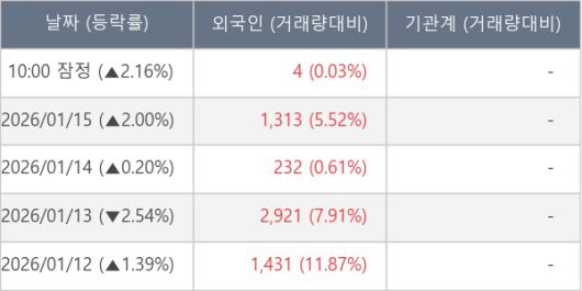[서울=뉴스핌] 로보뉴스 = 16일 10시 15분 현재 로지시스(067730)는 전일 대비 2.16% (현재가 2,605원) 상승했고, 외국인이 최근 5일 연속 순매수(누적 5,901주, 잠정) 행진을 하고 있다.