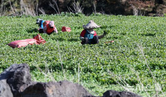 [제주=뉴시스] 우장호 기자 = 화창한 날씨를 보인 10일 오전 제주시 봉개동에서 농민들이 유채나물을 수확하고 있다. 겨울초라 불리는 유채나물은 2~4월이 제철이지만 기후가 온화한 제주에서는 겨울철에 주로 재배한다. 2025.12.10. woo1223@newsis.com |