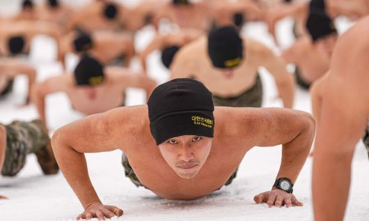 지난 15일 해병대 특수수색여단 장병들이 강원 평창군 황병산 일대에서 열린 2026년 동계 설한지 훈련에서 체력 단련을 실시하고 있다. 해병대사령부 제공 |