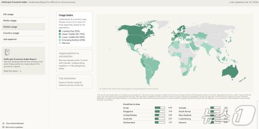 (서울=뉴스1) 김민석 기자 = 앤트로픽(Anthropic)이 글로벌 인공지능(AI) 실사용 현황을 분석한 4번째 '경제 지수(Economic Index) 보고서'를 공개하며 한국이 인구 대비 클로드 활용도가 세계 상위권이라고 16일 밝혔다.