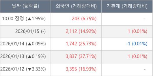 [서울=뉴스핌] 로보뉴스 = 16일 10시 15분 현재 오브젠(417860)은 전일 대비 1.95% (현재가 10,980원) 상승했고, 외국인이 최근 6일 연속 순매수(누적 12,748주, 잠정) 행진을 하고 있다.