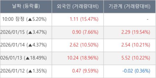 [서울=뉴스핌] 로보뉴스 = 16일 10시 15분 현재 기가비스(420770)는 전일 대비 5.20% (현재가 45,500원) 상승했고, 외국인이 최근 5일 연속 순매수(누적 15.34만 주, 잠정) 행진을 하고 있다.