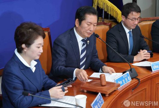 [서울=뉴스핌] 윤창빈 기자 = 정청래 더불어민주당 대표가 16일 서울 여의도 국회에서 열린 최고위원회의에서 의사봉을 두드리고 있다. 2026.01.16 pangbin@newspim.com