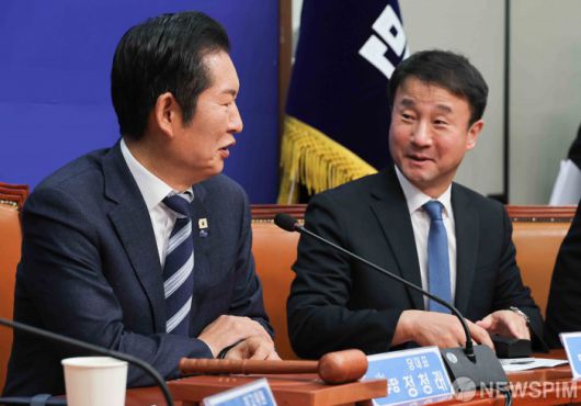 [서울=뉴스핌] 윤창빈 기자 = 정청래 더불어민주당 대표, 한병도 원내대표가 16일 서울 여의도 국회에서 열린 최고위원회의에서 대화를 나누고 있다. 2026.01.16 pangbin@newspim.com