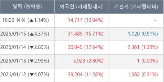 [서울=뉴스핌] 로보뉴스 = 16일 10시 15분 현재 이엔셀(456070)은 전일 대비 1.14% (현재가 15,940원) 상승했고, 외국인이 최근 5일 연속 순매수(누적 12.14만 주, 잠정) 행진을 하고 있다.
