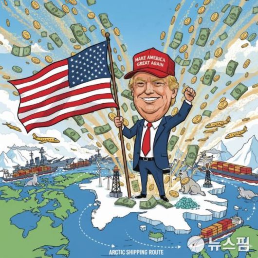 도널드 트럼프 미국 대통령과 그린란드 편입 구상을 표현한 일러스트 이미지. 이미지는 구글 제미나이 나노 바나나 생성 AI 이미지. [사진= 구글 제미나이] |