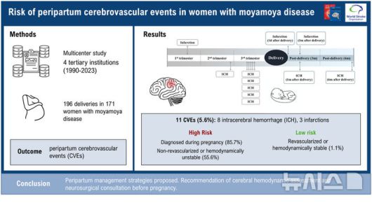 분석 결과 전체 출산 중 5.6%에서 임신·출산기 뇌졸중이 발생했다. 특히 임신 중 새롭게 모야모야병을 진단받은 산모(7명)에서는 85.7%로 높은 발생률을 보였고, 임신 전에 뇌혈류가 불안정했거나 필요한 뇌혈관문합술을 완료하지 못한 산모에서는 55.6%에서 뇌졸중이 발생해, 연구팀은 이들을 임신·출산기 뇌졸중 고위험군으로 분류했다.