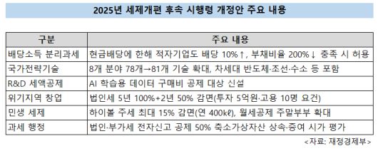 또 국가전략기술 범위를 확대해 차세대 반도체와 조선·수소 분야를 추가하고, 인공지능(AI) 연구에 필요한 학습용 데이터 구매비도 연구·개발(R&D) 세액공제 대상으로 새로 포함했다.
