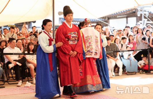 [서울=뉴시스] 김선웅 기자 = 사진은 2024년 9월29일 서울 중구 남산골한옥마을에서 '혼인잔치 : 가을편' 전통혼례의식 시연 행사가 열리고 있는 모습. 2024.09.29. mangusta@newsis.com |