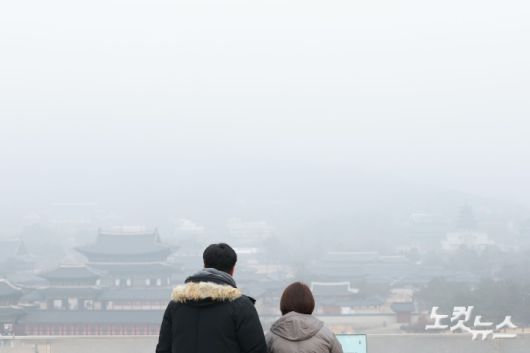 미세먼지 농도가 '나쁨' 수준을 보인 16일 오전 서울 종로구 광화문네거리 일대가 뿌옇게 보이고 있다.