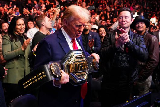 지난 2024년 11월 미국 뉴욕 메디슨스퀘어가든에서 열린 UFC 309 대회에서 헤비급 챔피언 존 존스의 벨트를 잠시 건네받고 감상중인 도널드 트럼프 미 대통령. 트럼프는 소문난 격투기, 프로레슬링 애호가다. 그 옆에는 당시 사이가 좋았던 일론 머스크 테슬라 CEO가 박수를 치고 있는 모습이다. 트럼프 미 행정부는 지난 해 12월 39개국에 대한 비자 제한 조치를 단행했지만, 올해 1월 15일 올림픽, 월드컵을 비롯해 UFC, WWE, MLB, NBA, MLS, F1 등 주요 프로대회의 출전선수와 코치진은 이 조치에서 제외하기로 했다. [게티이미지] |