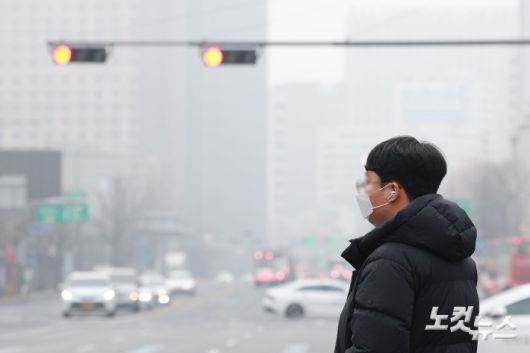 미세먼지 농도가 '나쁨' 수준을 보인 16일 오전 서울 종로구 광화문네거리 일대가 뿌옇게 보이고 있다.