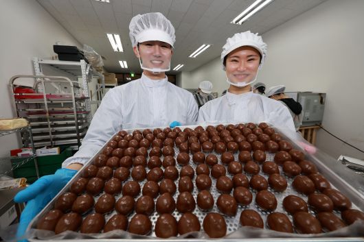 이윤민 아워포지티비티 대표와 김나리 제과장이 15일 경기 김포시 구래동 몬트쿠키 두바이쫀득쿠키(두쫀쿠)제작실에서 두바이쫀득쿠키를 들어보이고 있다. 두바이쫀득쿠키는 이윤민 대표의 아이디어와 김나리 제과장의 베이킹으로 탄생해 대중들의 많은 사랑을 받고 있다. /뉴스1 |