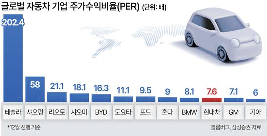 증권가는 현대차가 PER 200에 달하는 테슬라, 중국 BYD 등을 비교 기업군으로 설정하는 데에 검토하고 있다. 이들 기업들은 전기차와 자율주행, 로보틱스 사업을 영위하고 있다. 테슬라(202.4배)를 비롯해 샤오펑(58배), 리오토(21.1배), 샤오미(18.1배), BYD(16.3배) 등이다.