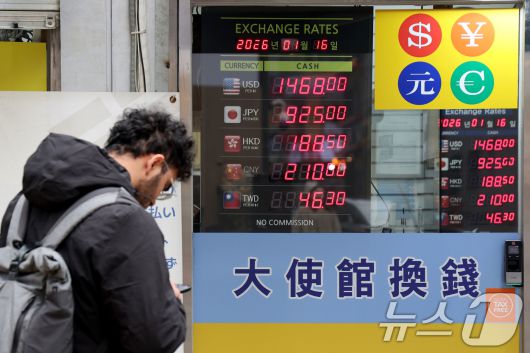 (서울=뉴스1) 이광호 기자 = 16일 서울 중구 명동 환전소 전광판에 환율 시세가 나오고 있다. 이날 서울 외환시장에서 원·달러 환율은 미국 고용지표 호조에 따른 달러 강세 영향으로 다시 1,470원 위로 상승했다. 2026.1.16/뉴스1
