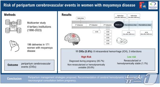 연구팀은 임신·출산기 뇌졸중 발생 여부를 기준으로 모야모야병 진단 시기와 임신 전 뇌 혈류 상태, 뇌혈관문합술 시행 여부를 분석했다. 또 분만 방식과 마취 방법이 뇌졸중 발생에 미치는 영향도 검토했으며, 단변량 및 다변량 로지스틱 회귀 분석을 통해 주요 위험 요인을 평가했다.