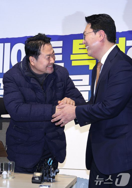 (서울=뉴스1) 신웅수 기자 = 천하람 개혁신당 원내대표가 16일 서울 여의도 국회에서 윤석열·김건희에 의한 내란·외환 및 국정농단 행위의 진상규명을 위한 특별검사 임명 등에 관한 법률안(2차 종합 특검)에 대한 무제한 토론(필리버스터)을 마친 후 단식 중인 장동혁 국민의힘 대표와 대화하고 있다. 2026.1.16/뉴스1