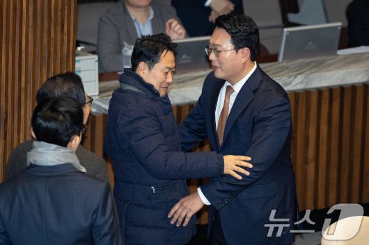 (서울=뉴스1) 유승관 기자 = 천하람 개혁신당 원내대표가 16일 서울 여의도 국회에서 열린 제431회 국회(임시회) 제1차 본회의에서 윤석열·김건희에 의한 내란·외환 및 국정농단 행위의 진상규명을 위한 특별검사 임명 등에 관한 법률안(2차 종합 특검)에 대한 무제한 토론(필리버스터)을 마친 후 장동혁 국민의힘 대표와 포옹하고 있다. 2026.1.16/뉴스1