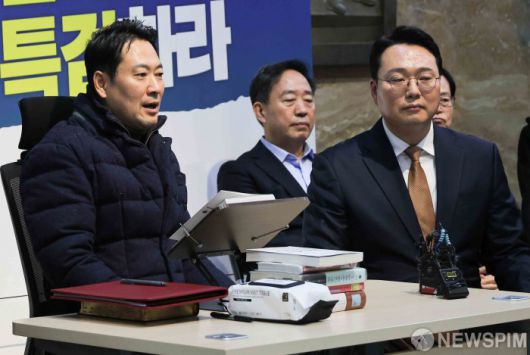 [서울=뉴스핌] 윤창빈 기자 = '쌍특검'을 촉구하며 단식 농성중인 장동혁 국민의힘 대표가 16일 서울 여의도 국회 로텐더홀 농성장에서 필리버스터를 마친 천하람 개혁신당 원내대표 등이 참석한 가운데 발언하고 있다. 2026.01.16 pangbin@newspim.com