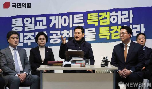[서울=뉴스핌] 윤창빈 기자 = '쌍특검'을 촉구하며 단식 농성중인 장동혁 국민의힘 대표(가운데)가 16일 서울 여의도 국회 로텐더홀 농성장에서 필리버스터를 마친 천하람 개혁신당 원내대표(오른쪽)를 만나 발언하고 있다. 2026.01.16 pangbin@newspim.com