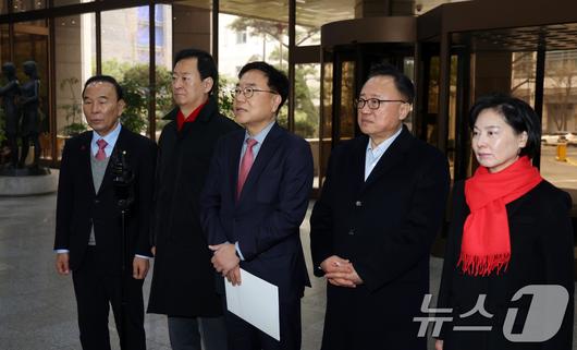 (서울=뉴스1) 황기선 기자 = 국민의힘 서범수, 박덕흠, 고동진 의원 등이 16일 오전 서울 종로구 서울경찰청에서 항의 방문 전 입장을 밝히고 있다. 국민의힘은 김병기·강선우 더불어민주당의원, 김경 서울시의원이 연루된 '공천 뇌물' 의혹과 관련해 경찰이 부실 수사를 하고 있다며 조속한 수사를 촉구했다. 2026.1.16/뉴스1