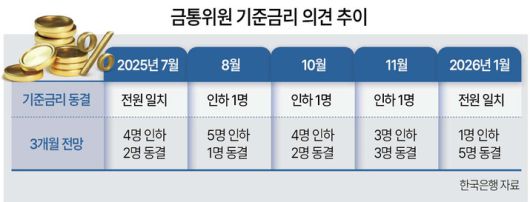 2024년 7월 금통위는 12회 연속 기준금리를 동결하면서도 통방문에 “기준금리 인하 시기 등을 검토”하겠다는 문구를 처음 넣으며 기준금리 인하 신호를 보냈다. 이후 8월 한 차례 더 금리를 동결한 뒤, 10월 0.25%포인트 금리를 낮추면서 본격적인 인하 기조에 돌입했다. 지난해 1월부터는 통방문에 “추가 인하 시기 및 속도 등을 결정하겠다”는 문구를 매번 넣으면서 2월과 5월 두 차례에 걸쳐 총 기준금리를 총 0.5%포인트 내렸다.