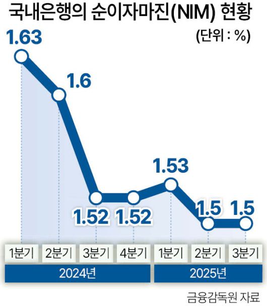 ▶‘NIM’ 반등 기대감…비이자이익은 ‘안갯속’=은행의 핵심 수익성 지표인 ‘순이자마진(NIM)’은 회복세를 보일 전망이다. 지난해 2분기 1.50%까지 하락하며 2년 만에 최저치를 기록했던 NIM이 바닥을 찍고 반등할 것이라는 분석이다. NIM이 확대되면 은행의 대출 관련 수익성은 개선되지만, 예·적금 금리 정체 등으로 인해 은행에 돈을 맡긴 고객의 수익성은 악화될 수 있다.