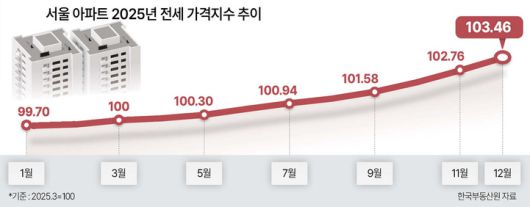 한국부동산원이 발표한 ‘2025년 12월 전국주택가격동향조사’에 따르면 서울 전세가격지수는 전월 대비 0.53% 상승했다. 월별 추이를 봐도 지난해 1년 내내 상승 흐름을 이어갔다. 전국(0.28%), 수도권(0.42%), 지방(0.15%) 등도 모두 상승세다.
