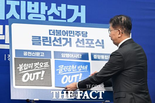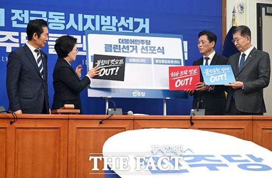 정 대표는 "투명한 공천을 약속하고 공정한 경선을 저해하는 행위를 근절·엄단하겠다는 의지를 보이기 위해 이 자리를 마련했다"며 "다가오는 지방선거에서 깨끗한 선거, 당원주권이 온전히 실현되는 공정한 선거를 하겠다"고 말했다.