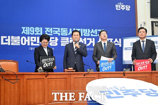 [더팩트ㅣ국회=남용희 기자] 권향엽 공천신문고단장과 정청래 더불어민주당 대표, 이상식 클린선거암행 어사단장, 조승래 사무총장(왼쪽부터)이 16일 오전 서울 여의도 국회에서 열린 더불어민주당 클린선거 선포식에서 기념촬영을 하고 있다.