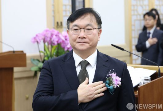 [서울=뉴스핌] 정일구 기자 = 박영재 신임 법원행정처장이 16일 오전 서울 서초구 대법원에서 열린 취임식에서 국민의례를 하고 있다. 2026.01.16 mironj19@newspim.com