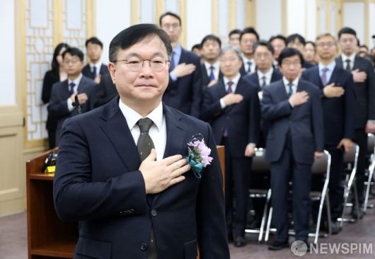 [서울=뉴스핌] 정일구 기자 = 박영재 신임 법원행정처장이 16일 오전 서울 서초구 대법원에서 열린 취임식에서 국민의례를 하고 있다. 2026.01.16 mironj19@newspim.com