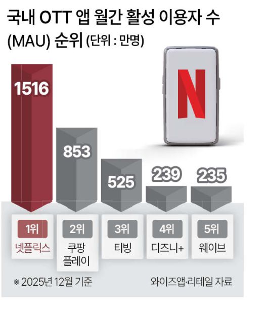 국내 이용자 역시 역대 최대 수준으로 늘었다. 와이즈앱·리테일에 따르면, 지난해 12월 국내 OTT 시장에서 넷플릭스의 월간 활성 이용자 수(MAU)는 1516만명을 기록했다. 이는 넷플릭스가 국내에 서비스를 시작한 후 역대 최대 규모다. 이어 쿠팡플레이(853만명) 2위, 티빙(525만명) 3위, 디즈니+(239만명) 4위, 웨이브(235만명) 5위 순으로 집계됐다. 박세정·차민주 기자