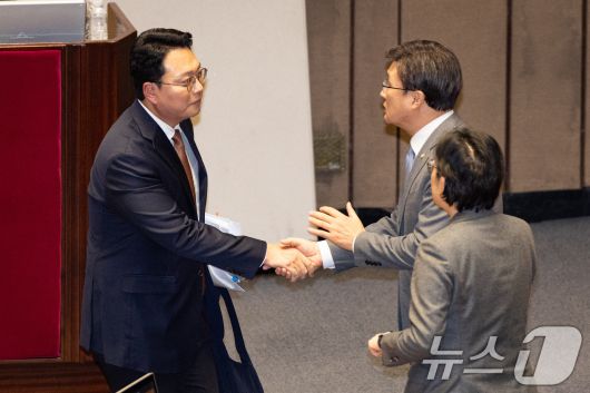 (서울=뉴스1) 유승관 기자 = 천하람 개혁신당 원내대표가 16일 서울 여의도 국회에서 열린 제431회 국회(임시회) 제1차 본회의에서 윤석열·김건희에 의한 내란·외환 및 국정농단 행위의 진상규명을 위한 특별검사 임명 등에 관한 법률안(2차 종합 특검)에 대한 무제한 토론(필리버스터)을 마친 후 국민의힘 김대식, 조지연 의원과 인사하고 있다. 2026.1.16/뉴스1