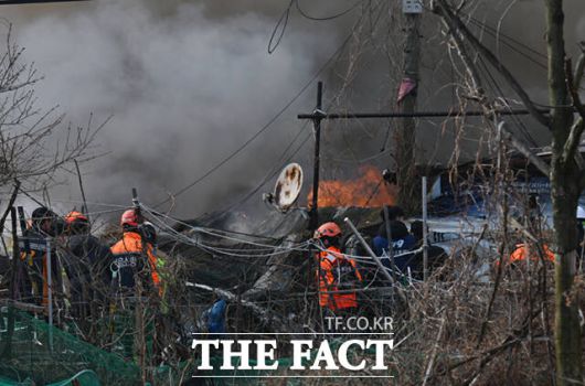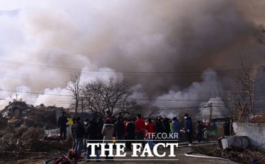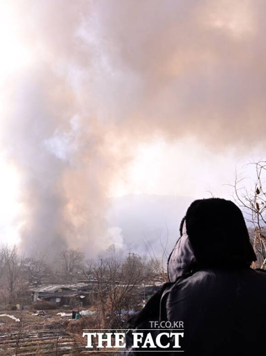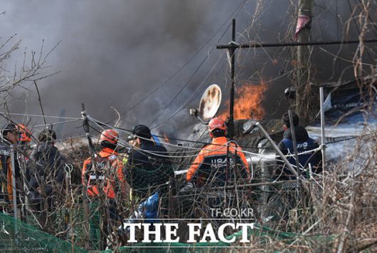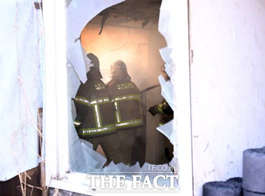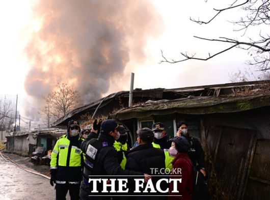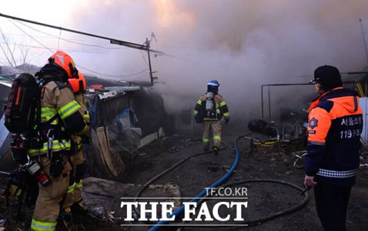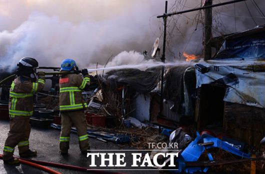 [더팩트ㅣ이새롬 기자] 16일 오전 서울 강남구 구룡마을 4지구에서 화재가 발생한 가운데, 소방관들이 화재 현장에 물을 뿌리고 있다.