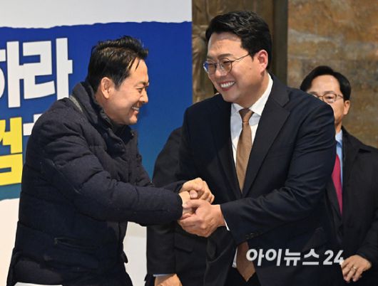 [아이뉴스24 곽영래 기자]통일교 및 공천뇌물 특검 수용 촉구 단식 농성 중인 장동혁 국민의힘 대표가 16일 서울 여의도 국회 로텐더홀에서 '2차 종합특검법안'에 대한 무제한 토론을 마친 개혁신당 천하람 원내대표와 인사를 하고 있다.