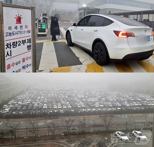초미세먼지 비상저감조치 2부제 시행, 정부세종청사 옥외 주차장 출입 막힌 차량으로 가득