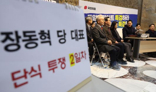 국민의힘 장동혁 대표는 16일 여당을 향해 통일교 로비 의혹, 공천헌금 의혹 등 이른바 '쌍특검법' 수용을 촉구하며 이틀째 단식 농성을 이어갔다. 장 대표는 전날 국민의힘 의원들과 함께 로텐더홀에서 규탄대회를 열고 "국민의 목소리가 모이는 이곳 국회 본회의장 로텐더홀에서 특검법 수용을 촉구하는 단식을 시작한다"고 밝혔다. 허정호 선임기자 hoya@segye.com ⓒ 세상을 보는 눈, 세계일보