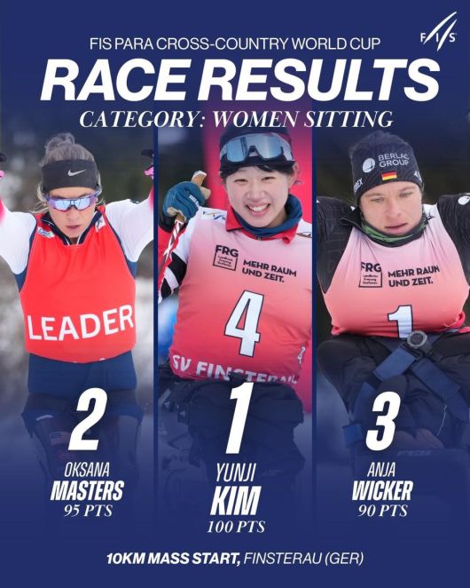 김윤지는 15일 독일 핀스터라우에서 열린 2026 FIS(국제스키연맹) 파라 크로스컨트리 월드컵 10㎞ 매스스타트 프리(여자 좌식 부문) 1위를 했다. 이 종목엔 9개 나라에서 20명이 레이스를 펼쳤는데, 김윤지는 31분 47초 70의 기록을 냈다. 미국의 옥사나 마스터스(32분 20초 30)와 독일의 안야 비커(32분 45초 80)를 제쳤다.