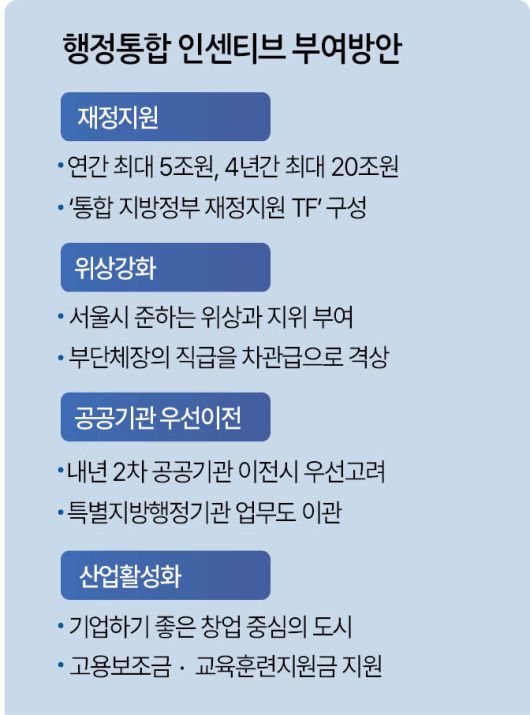 정부가 행정통합이 이뤄지는 ‘통합특별시’(가칭)에 각각 연간 최대 5조원, 4년간 최대 20조원을 지원하는 등의 파격 인센티브를 발표하면서 6·3 지방선거를 5개월여 앞두고 선거판을 뒤흔들 정치권의 핵심 이슈로 급부상하는 모습이다.