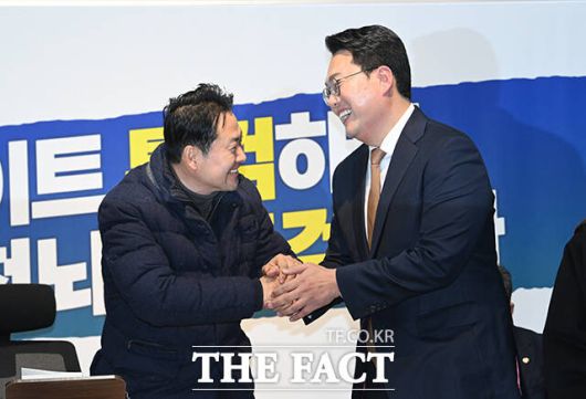 [더팩트ㅣ국회=박헌우 기자] 천하람 개혁신당 원내대표(오른쪽)가 16일 오전 서울 여의도 국회 로텐더홀에서 단식농성에 돌입한 장동혁 국민의힘 대표를 찾아 손을 맞잡고 있다.