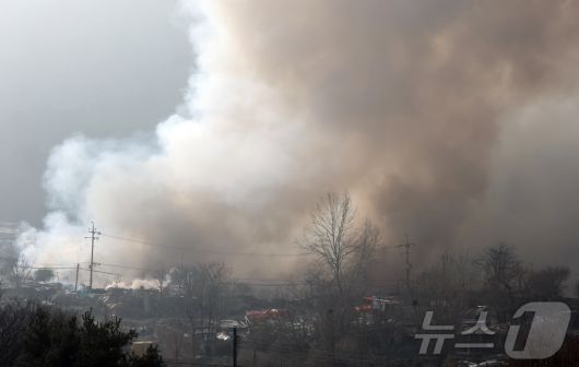 (서울=뉴스1) 김진환 기자 = 16일 서울 강남구 개포동 구룡마을에서 연기가 치솟고 있다. 소방당국에 따르면 현재까지 인명피해는 발생하지 않았으며 4지구 내 주민 47명(37가구)은 현장을 벗어나 대피했다고 밝혔다. 당국은 산불진화차량 113대, 진화인력 534명을 긴급 투입해 지상 진화활동을 벌이고 있다. 2026.1.16/뉴스1