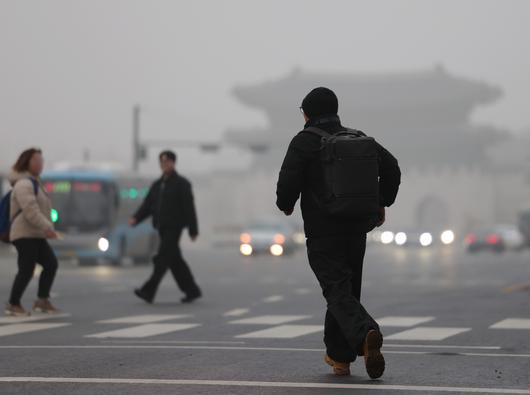 미세먼지와 초미세먼지 농도가 ‘나쁨’ 수준을 보인 16일 서울 광화문광장 인근에서 시민들이 횡단보도를 건너고 있다. 연합뉴스 |