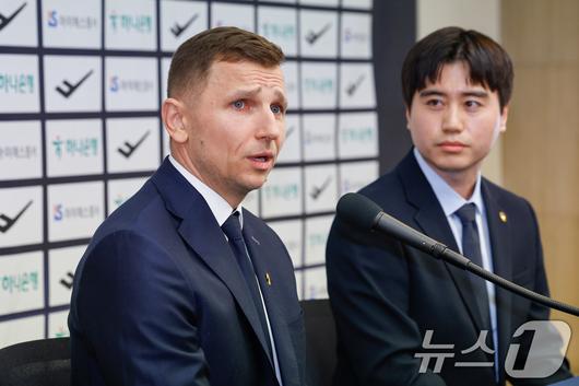 (서울=뉴스1) 안은나 기자 = 남자 농구 국가대표팀을 이끌게 된 니콜라이스 마줄스(Nikolajs Mazurs) 감독이 16일 서울 중구 프레스센터에서 취임 기자회견을 하고 있다. 2026.1.16/뉴스1