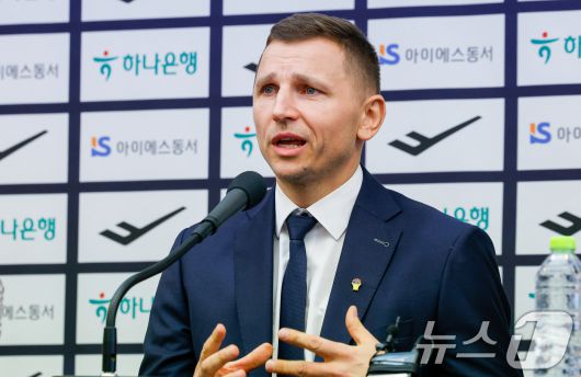 (서울=뉴스1) 안은나 기자 = 남자 농구 국가대표팀을 이끌게 된 니콜라이스 마줄스(Nikolajs Mazurs) 감독이 16일 서울 중구 프레스센터에서 취임 기자회견을 하고 있다. 2026.1.16/뉴스1