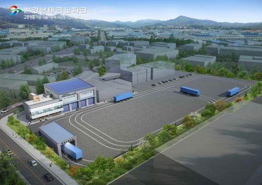 김해 명동산단에 건립될 ‘고중량 AMR 시험평가센터’ 조감도. 항만 기후 재현 환경시험터널과 40t급 로봇 5대를 동시 실증하는 1만1100㎡ 규모의 주행시험장이다. [경남도 제공] |