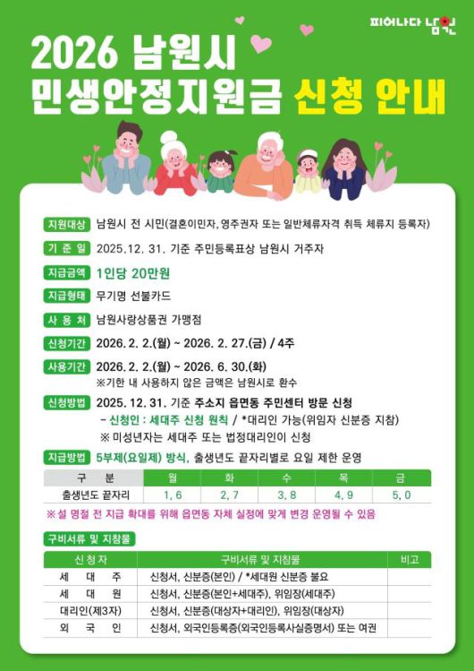 지원금은 2026년 2월 2일부터 2월 27일까지 4주간 지역화페인 남원사랑상품권으로 지급될 예정이며, 읍·면·동 행정복지센터에서 세대주 신청과 수령한다.