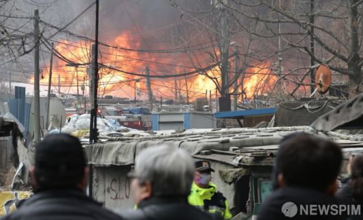 [서울=뉴스핌] 양윤모 기자 = 16일 오전 5시경 서울 강남구 개포동 구룡마을 4구역에서 화재가 발생해 소방 통제선 밖에서 주민들이 현장을 지켜보고 있다. 소방당국은 대응 1단계를 2단계로 격상하고 추가 인력을 투입 진화를 완료했다. 2026.01.16 yym58@newspim.com |