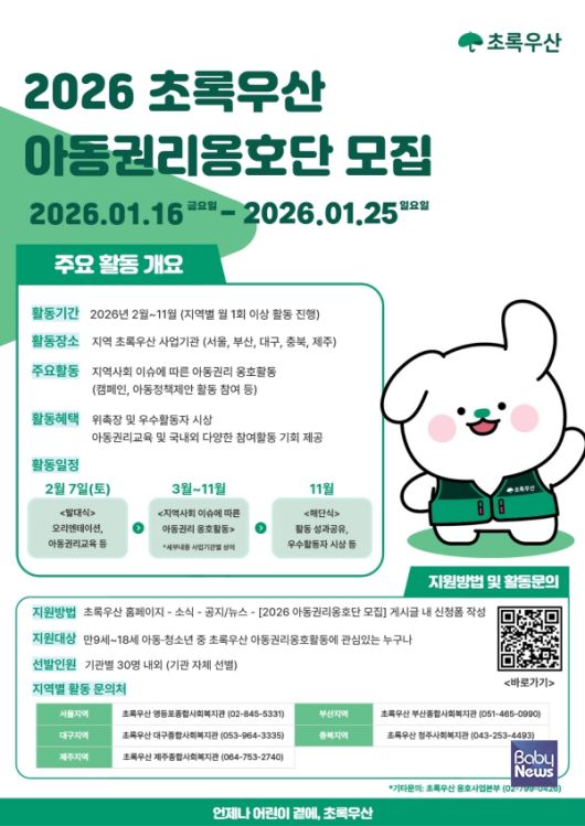 아동복지전문기관 초록우산(회장 황영기)이 16일 '2026 초록우산 아동권리옹호단’을 모집한다고 16일 밝혔다.
