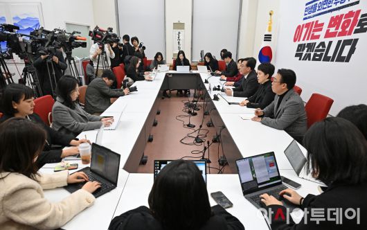 아시아투데이 송의주 기자 = 송언석 국민의힘 원내대표가 16일 국회에서 기자간담회를 열고 통일교 특검 등 현안 관련 발언을 하고 있다. ⓒ "젊은 파워, 모바일 넘버원 아시아투데이"